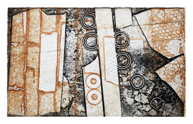 Die braunen und schwarzen Flächen und der darunter liegende farblose Prägedruck schaffen eine schöne, harmonisch ruhige Tiefenschichtung, die uns zuerst abstrakt anmutet, aber bei näherem Hinsehen stellen sich Assoziationen an Buchrücken und Baumstämme oder an Blätter und Waldböden ein. Es ist diese Balance zwischen abstrakten Formen und konkreten Erinnerungsstücken, die das Blatt spannend und vielschichtig macht. Die kompositiorische Ausgewogenheit und Ruhe macht es uns möglich, konzentriert die Details im Blatt zu genießen, die sich aus den Materialien, die auf die Kupferplatte aufgeklebt wurden, ebenso ergeben wie aus den vorsichtig eingefügten Ätz- und Kratzspuren.